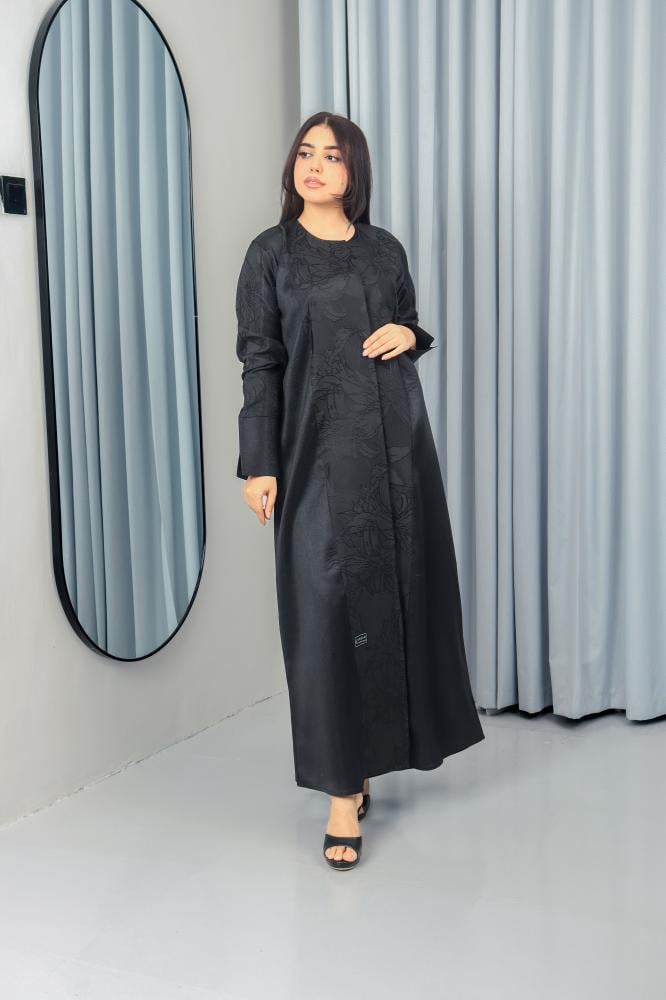 عباية تفته أمام جاكار سوداء فاخرة بلمعة خفيفة وتطريز أنيق راقي