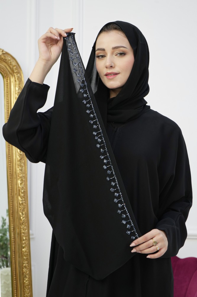✨ أضيفي لمسة لامعة لإطلالتك مع طرحة سوداء أنيقة مطرزة بكريستال فضي يعكس الفخامة والرقي.