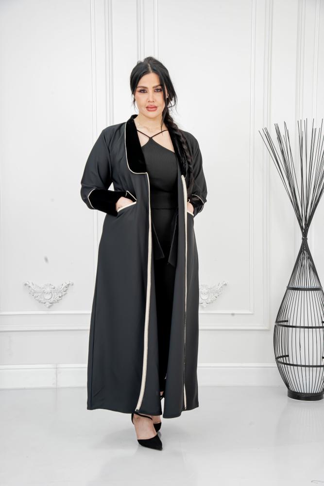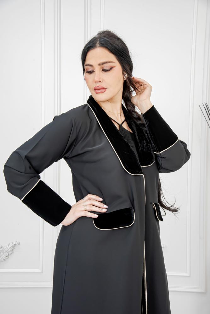 العباية مزودة بتفاصيل قلاب أنيقة وأكمام قطيفة راقية، مع إمكانية إضافة زرار حسب الرغبة لمزيد من العملية.