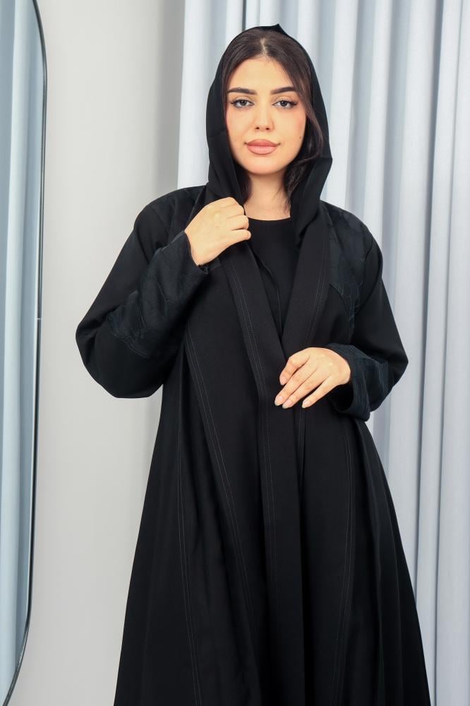 إغلاق العباية بأزرار مخفية بالكامل ليمنحك مظهراً أنيقاً ومتكاملاً دون أي تفاصيل زائدة.