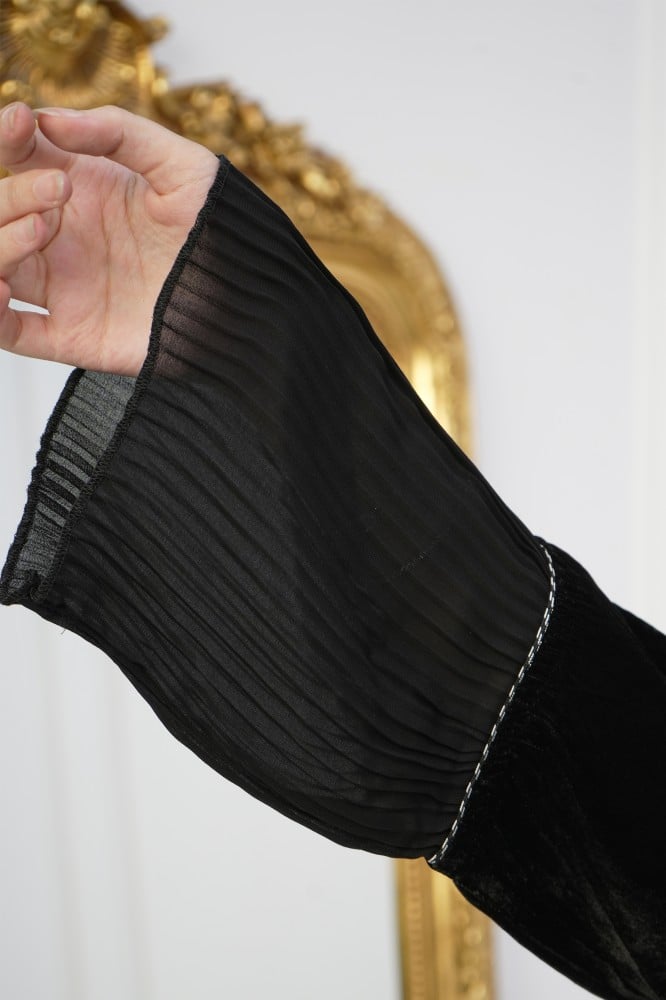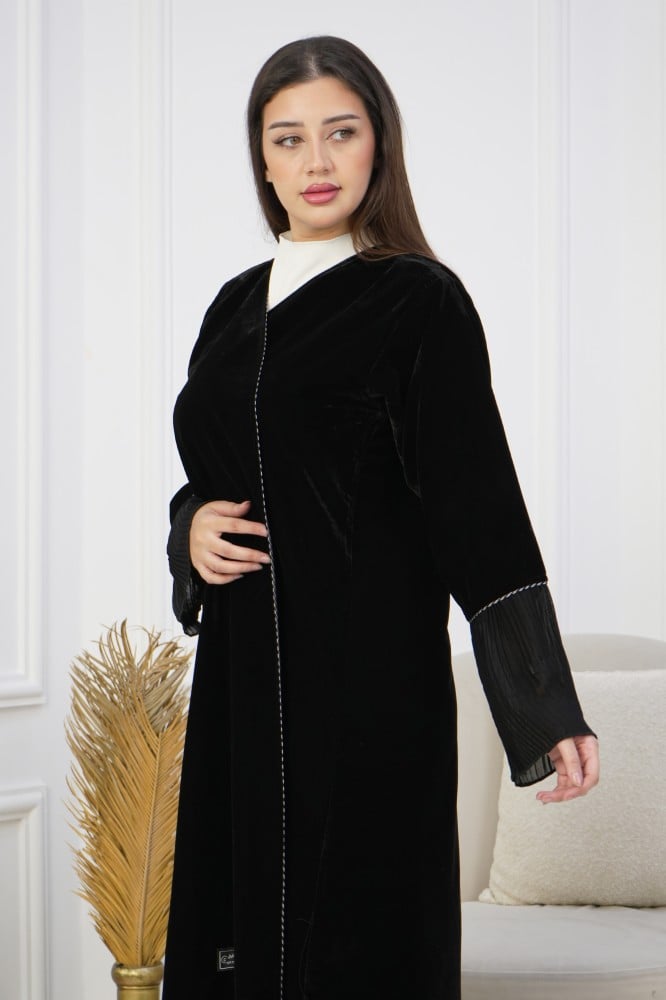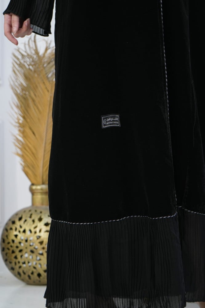 ✨ استمتعي بإطلالة دافئة وفاخرة مع هذه العباية المصنوعة من قماش القطيفة الفاخر بتفاصيل راقية من كسرات قماش الليزر على الأكمام وأسفل العباية.