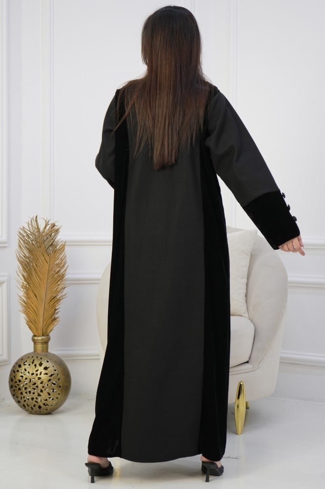 يأتي التصميم بقلاب مخمل ناعم يمنح العباية لمسة راقية، مع قصة لف عملية تبرز أناقتك بأسلوب محتشم.