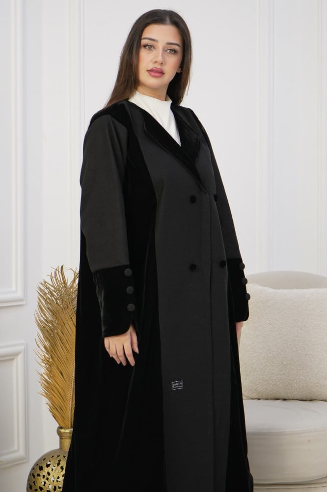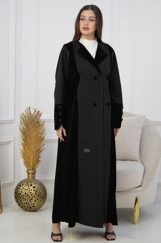 تتميز العباية بثلاثة أزرار جانبية وأربعة أزرار أمامية من المخمل لمزيد من التميز، وتُرفق بطرحة أنيقة لتكمل إطلالتك الكاملة.
