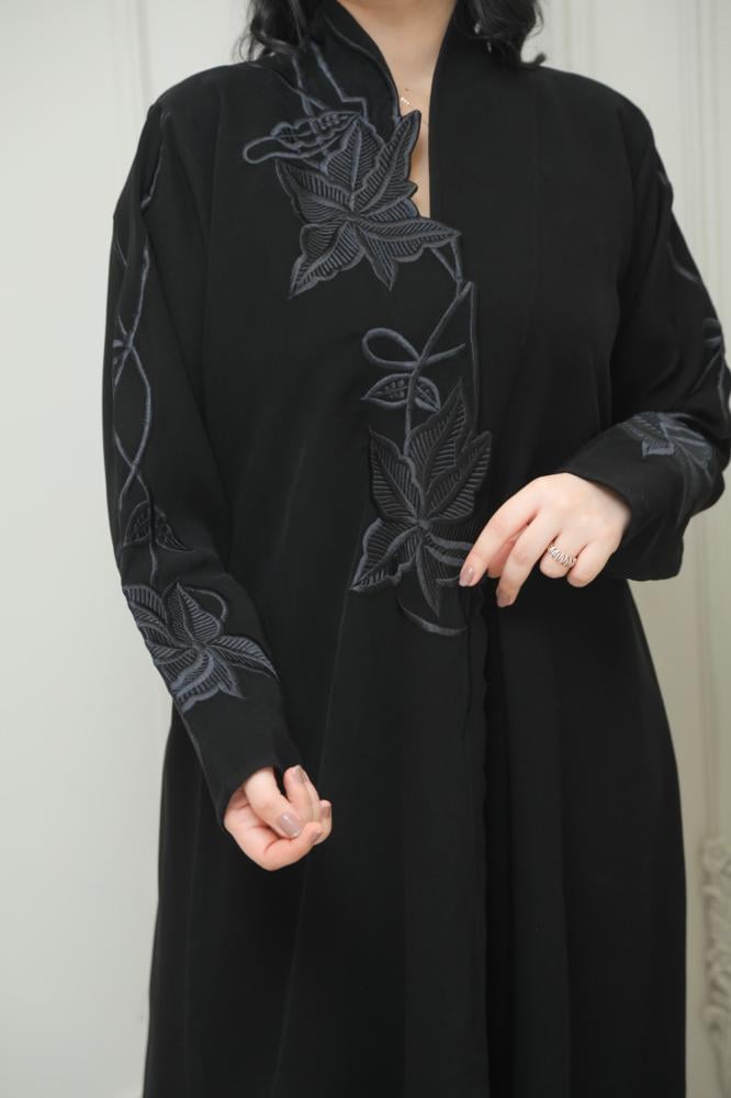 تصميمها العصري بأسلوب لف بدون زرار يمنحك راحة عملية وسهولة ارتداء، بينما يزينها التطريز الحلوزني الراقي على الأكمام والصدر ليضفي لمسة أنثوية ملكية تلفت الأنظار.✨